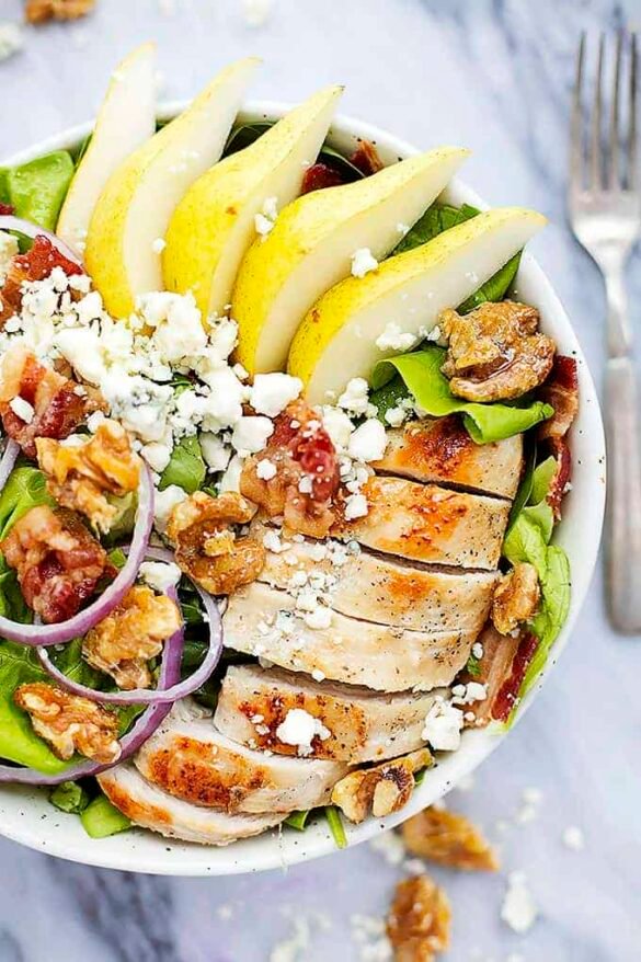 Grilled Chicken, Bacon, and Pear Salad with Poppyseed dressing is made with crisp romaine lettuce, tender and juicy grilled chicken and pears. Topped with Walnuts, feta cheese, and a creamy poppyseed dressing this salad is phenomenal!
