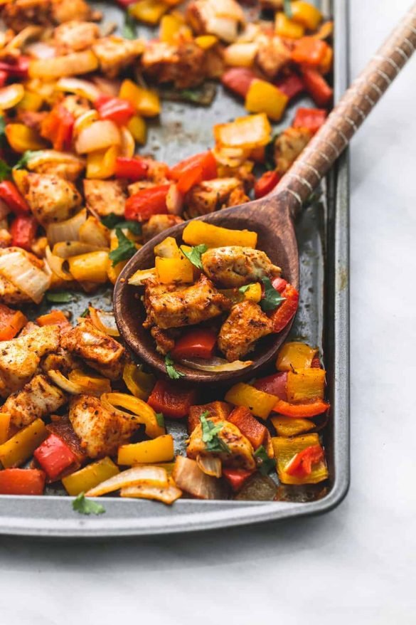 Fajitas are one of our favorite dinners and this one pan spin-off is a new must have meals on the dinner rotation. Chicken and veggies all made on a sheet pan with zesty lime and spicy seasonings. First you toss your veggies and chicken in a bowl with oil and seasonings, then spread it all out on a sheet pan and bake for about 15-20 minutes. Then just drizzle fresh lime juice on top and sprinkle with chopped cilantro. You can eat it as-is, or serve it over rice.