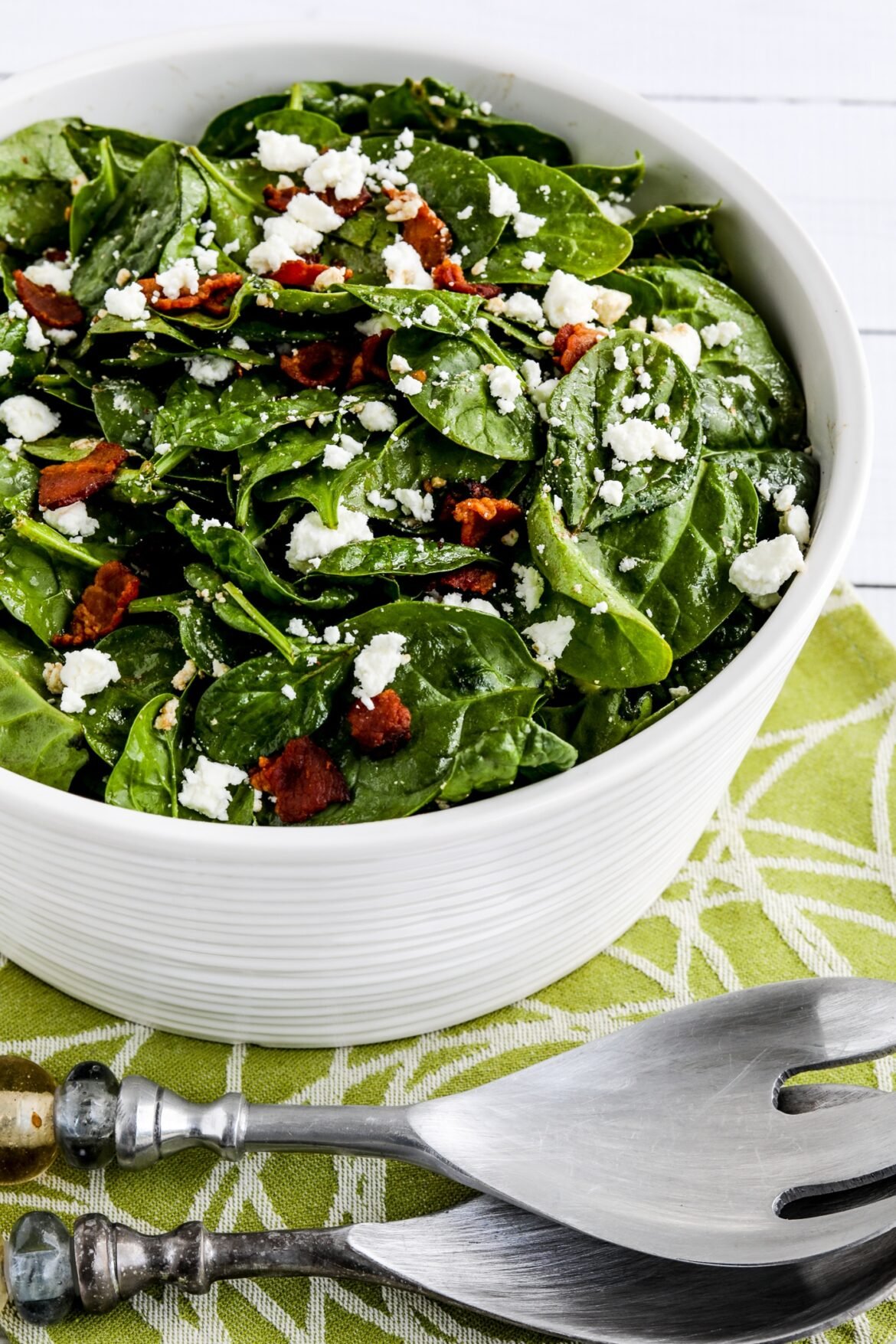I think spinach salad is a wonderful thing, and of course spinach salad with bacon is especially good. Not only does this combination taste fantastic, but leafy green vegetables like spinach provide more nutrients than any other food. And this Spinach Salad with Bacon and Feta has the wonderful combination of bacon + Feta cheese to make it especially delicious and it’s super low in carbs.