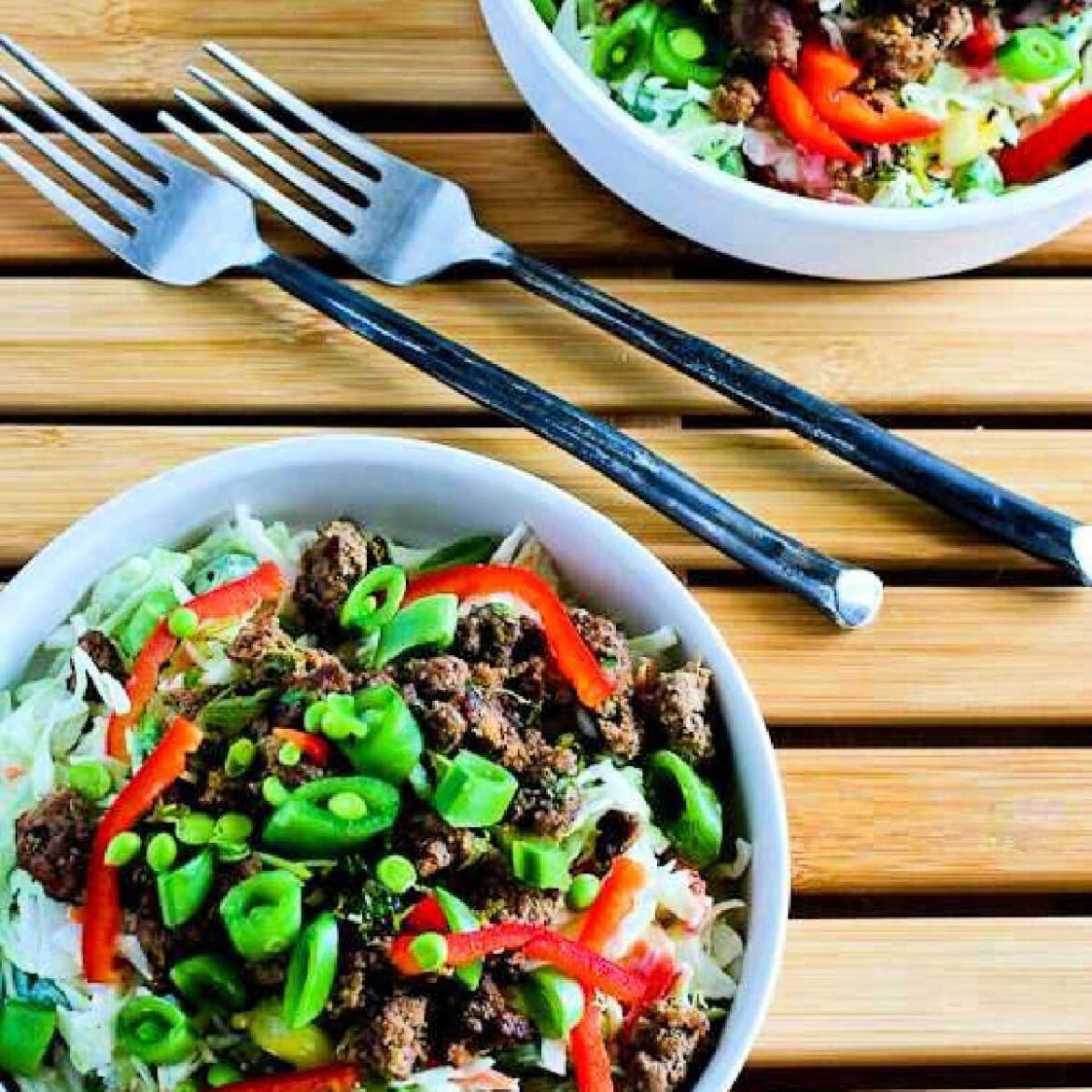 Sriracha Beef Cabbage Bowl is a perfect recipe for low-carb eating plans and for the original South Beach Diet. Most commercial coleslaw mix has carrots which are higher in carbs and aren’t permitted for South Beach Phase One, but the amount of carrots is very small, so I wouldn’t stress over it. Cut up your own cabbage if it’s important to you to have slightly fewer carbs.