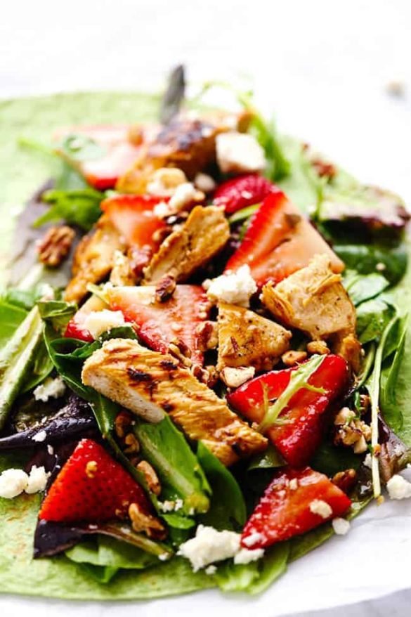 Fresh Spring greens, strawberries, crunchy pecans, chicken, and feta cheese come together in this delicious and healthy wrap. It is drizzled in balsamic dressing and the flavor is amazing!