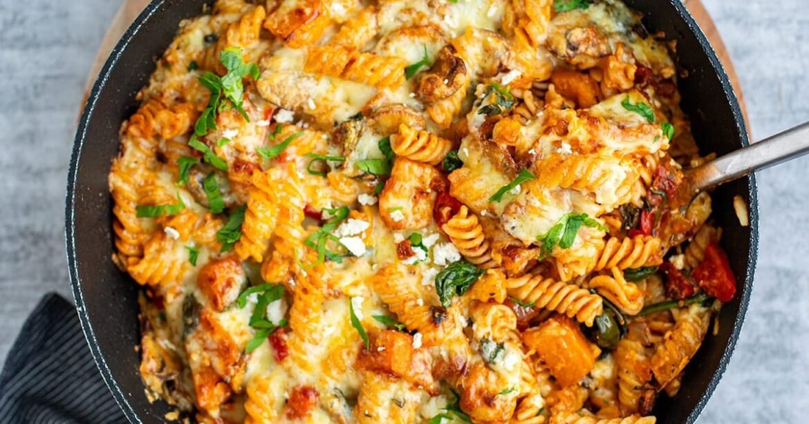 My favourite veggie pasta bake filled with vegetables like roasted butternut squash, mushrooms, peppers, and spinach, paired with a delicious tomato sauce and baked with feta and Cheddar cheeses. Comforting dinner that is also nutrient-dense.
